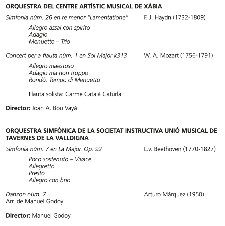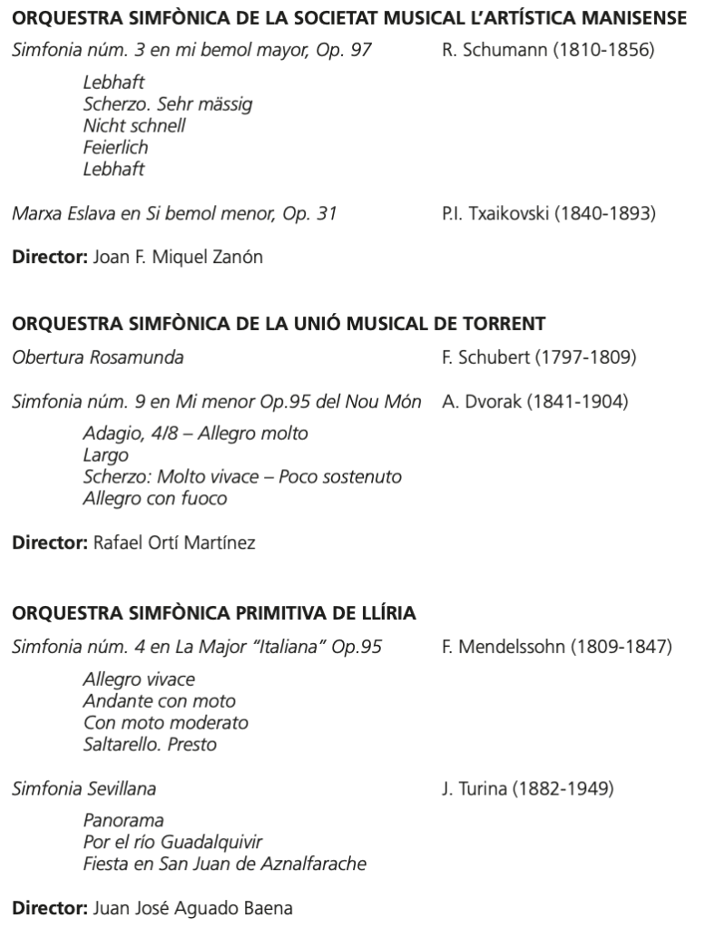 El Concurs donarà inici diumenge a les 10.30h amb la categoria Salvador Giner. Competiran en esta categoria l’ORQUESTRA DEL CENTRE ARTÍSTIC MUSICAL DE XÀBIA, dirigida per Joan A. Bou Vayà; i l’ORQUESTRA SIMFÒNICA DE LA SOCIETAT INSTRUCTIVA UNIÓ MUSICAL DE TAVERNES DE LA VALLDIGNA, baix la direcció de Manuel Godoy. El programa que interpretaran ambdues orquestres serà el següent:
