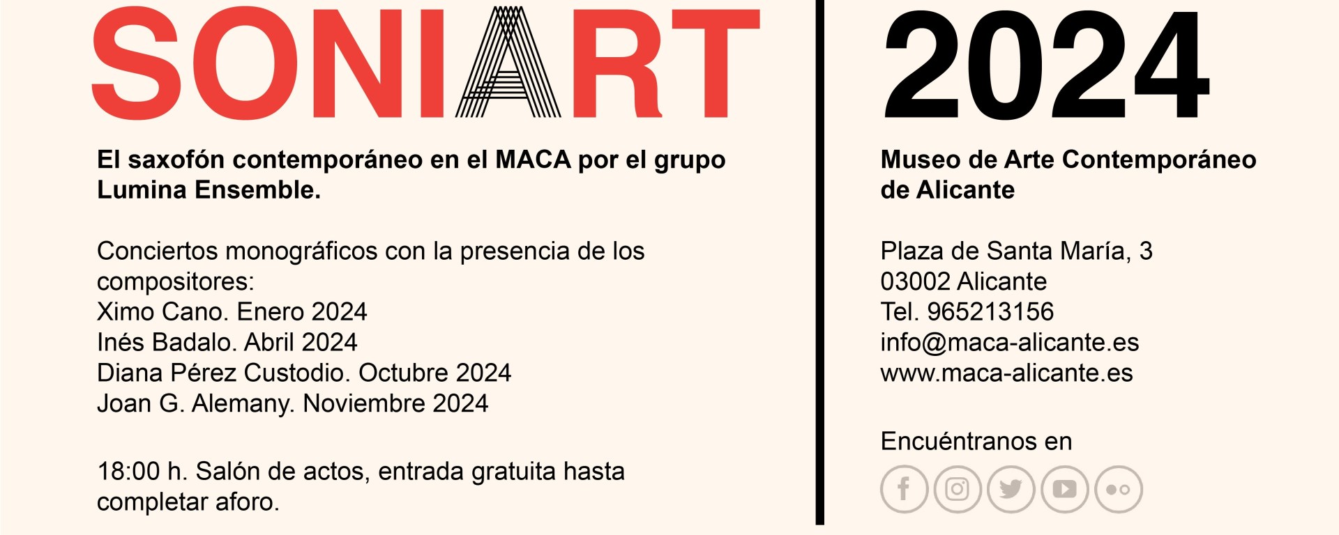 SoniArt torna a reprendre els seus concerts en el MACA. La quarta edició d’este programa de concerts compta amb l’al·licient de la presència dels compositors, els qui ens descobrixen els processos de la composició de cadascuna de les peces, així com del fonament de les seues estètiques personals, permetent un acostament de l’oient natural i sense prejudicis.