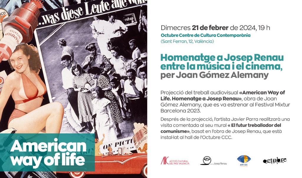 El dia 21 de febrer a les 19h en l’Octubre Centre de Cultura Contemporània (OCCC), es presenta per primera vegada a València i en el seu format cinematogràfic, l’obra de Joan Gómez Alemany «AMERICAN WAY OF LIFE. Homenatge a Josep Renau». Va ser el dia 5 d’octubre del 2023 en el Festival Mixtur de Barcelona, on s’estrenà la primera aproximació des de la música contemporània a la sèrie de fotomuntatges de Josep Renau titulada “The American Way of Life”. Ara arriba a la nostra ciutat en una activitat centrada en Renau, on primerament es mostrarà l’obra assenyalada i seguidament Javier Parra comentarà el seu mural «El futur treballador del comunisme», basat també en un treball de Renau i que actualment es pot veure al vestíbul de l’OCCC.