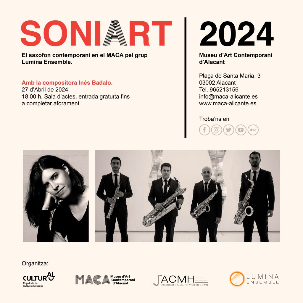 SoniArt vuelve con un monográfico dedicado a una de las compositoras con más proyección del panorama compositivo nacional. Inés Badalo nos presentará su producción saxofonística interpretada por Lumina Ensemble. Además el programa se completa con una pieza para percusión interpretada por Óscar Martí.