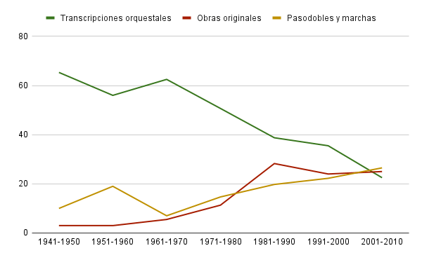 Así pues observamos como en las décadas de los años 40 y 50 del pasado siglo la interpretación de obras compuestas originalmente para banda era escasa, si bien sí se interpretaban piezas escritas directamente para banda de duración menor como pasodobles y marchas, generalmente, ubicadas como piezas de apertura del concierto. A partir de los años 60 se observa un incremento en la interpretación de obras originalmente compuestas para estas formaciones hasta alcanzar el clímax en los años 80, manteniéndose desde entonces en, aproximadamente, un cuarto del repertorio interpretado. Por otro lado, la interpretación de obras orquestales transcritas a banda de música se ha ido reduciendo de forma pareja al crecimiento del repertorio original para banda. Si aproximadamente dos tercios del repertorio interpretado procedía del ámbito orquestal en los años 40, en el cambio de siglo se había reducido a la quinta parte de las obras interpretadas.