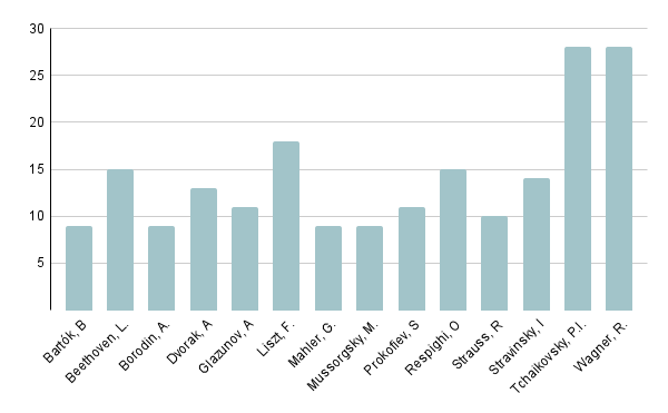 Generalmente, las obras transcritas proceden principalmente, además del teatro escénico español, del corpus de compositores que forman el canon musical occidental decimonónico. De la relación de piezas transcritas publicadas por la revista musical Harmonia en las primeras décadas del siglo XX[3] podemos extraer nombres como Beethoven, Berlioz, Bizet, Brahms, Grieg, Mozart, Mussorgsky, Rimsky-Korsakov, Tchaikovsky, Wagner o Weber, entre otros. Varios de estos nombres se repiten al observar las obras elegidas para participar en el Certamen Internacional de Bandas de Música de Valencia desde su creación en 1886 hasta 2010. Si ponemos el foco en las catorce bandas[4] que han participado en más de veinte ocasiones en este concurso, vemos como aproximadamente el 84% de las obras elegidas no se escribieron originalmente para banda. En la gráfica 2, se muestran los compositores más interpretados por estas bandas, entre los que destacan ampliamente Tchaikovsky y Wagner.