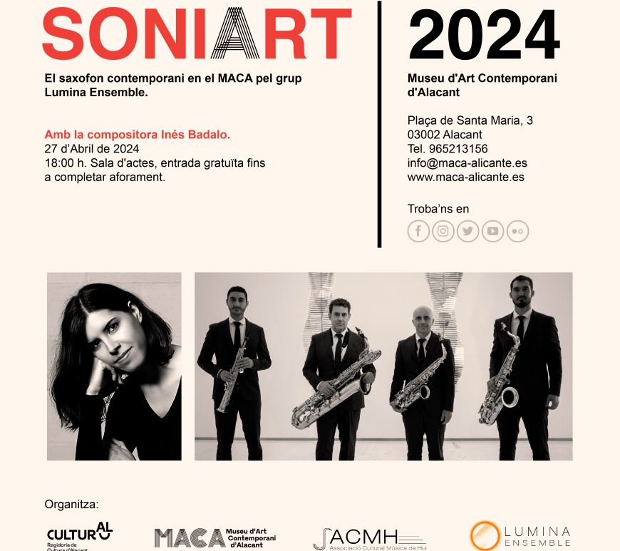 Este próximo sábado 1 de febrero comienza la quinta edición de “SoniArt, el saxofón contemporáneo en el MACA”. Un ciclo de conciertos compuesto por cinco conciertos que se llevarán a cabo a lo largo de todo el 2025. La edición de 2024 contó con la presencia de cuatro compositores de los que apreciamos sus estéticas, cambiantes a lo largo de sus propias trayectorias compositivas. Ximo … Continúa leyendo SoniArt 2025 pretende acercar la música de nueva creación al gran público, a través de conciertos donde los propios compositores hablan de sus obras y sus procesos creativos.